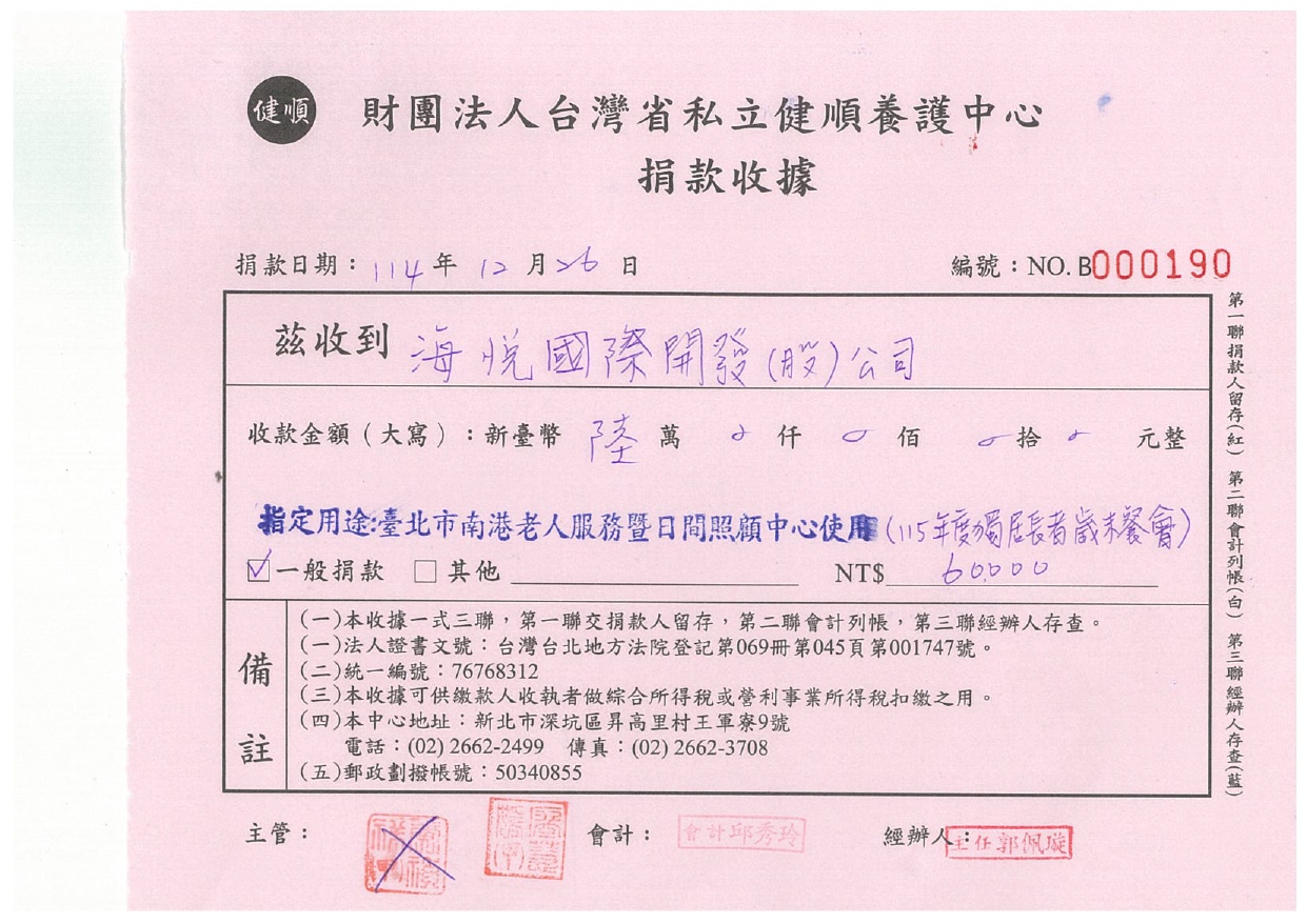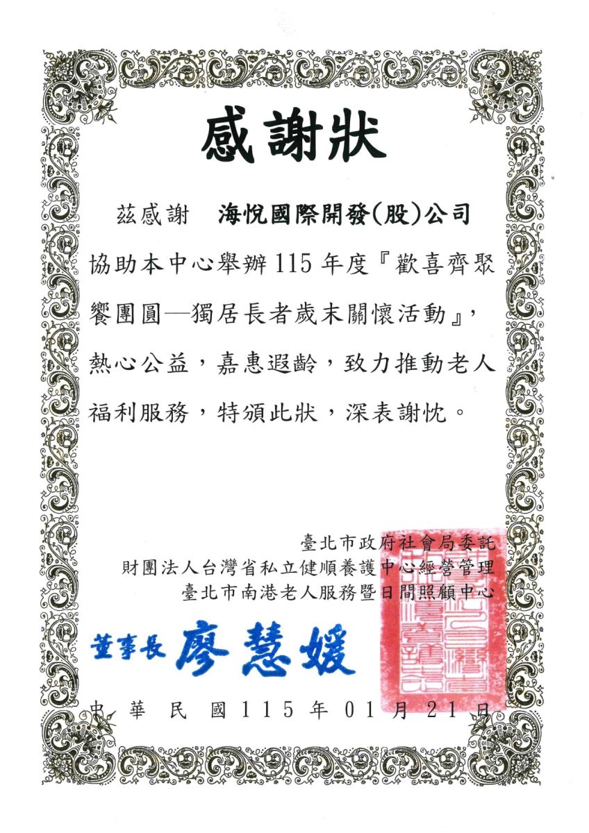 海悅國際始終秉持「取之於社會,用之於社會」的初心,今年歲末,我們特別捐款 6 萬元予「財團法人台灣省私立健順養護中心」,專款支持臺北市南港老人服務暨日間照顧中心所舉辦的:「歡喜齊聚饗團圓」獨居長輩歲末關懷餐會。對於許多獨居長者而言,節慶的團聚不僅是一頓溫飽,更是心靈的慰藉。海悅國際希望透過實質的資金挹注,確保長輩們能在溫馨的氛圍中享受豐盛的團圓飯,感受到來自社會的重視與溫暖。 我們深信,企業的參與能成為長者身後堅實的後盾。未來,海悅將持續深耕在地公益,讓愛心走入社區,為更多需要幫助的人點亮希望之光。